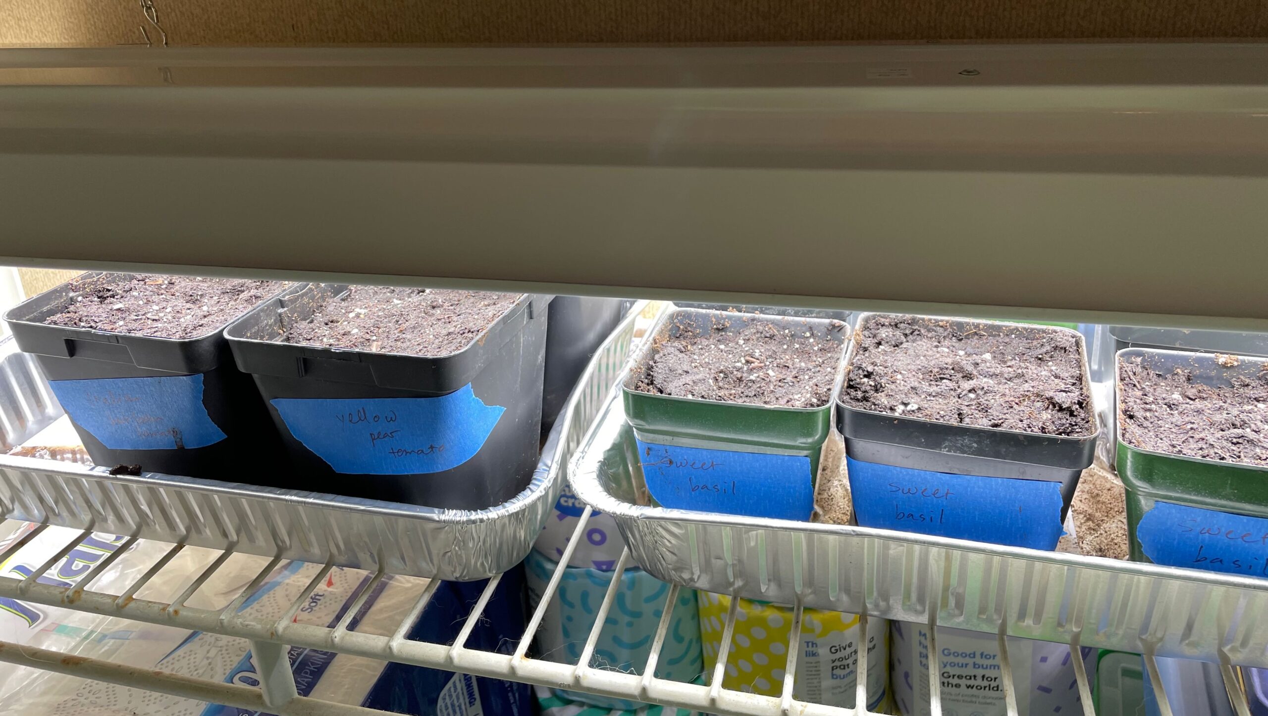 Amazingly, after a few days in my carefully curated seed-starting soil under my inexpensive but specially purchased grow lights on a shelf hastily cleared in the basement: all four tomato plants sprouted. Hooray!