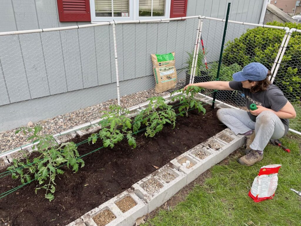 After a weekend of work—the hardest part of which was puzzling over which PVC connector types we needed and how many—we had one fantabulous raised bed for my baby tomato plants, who were by now absolutely longing to be planted outside. I could tell. By this time, I could read their little vegetable minds.