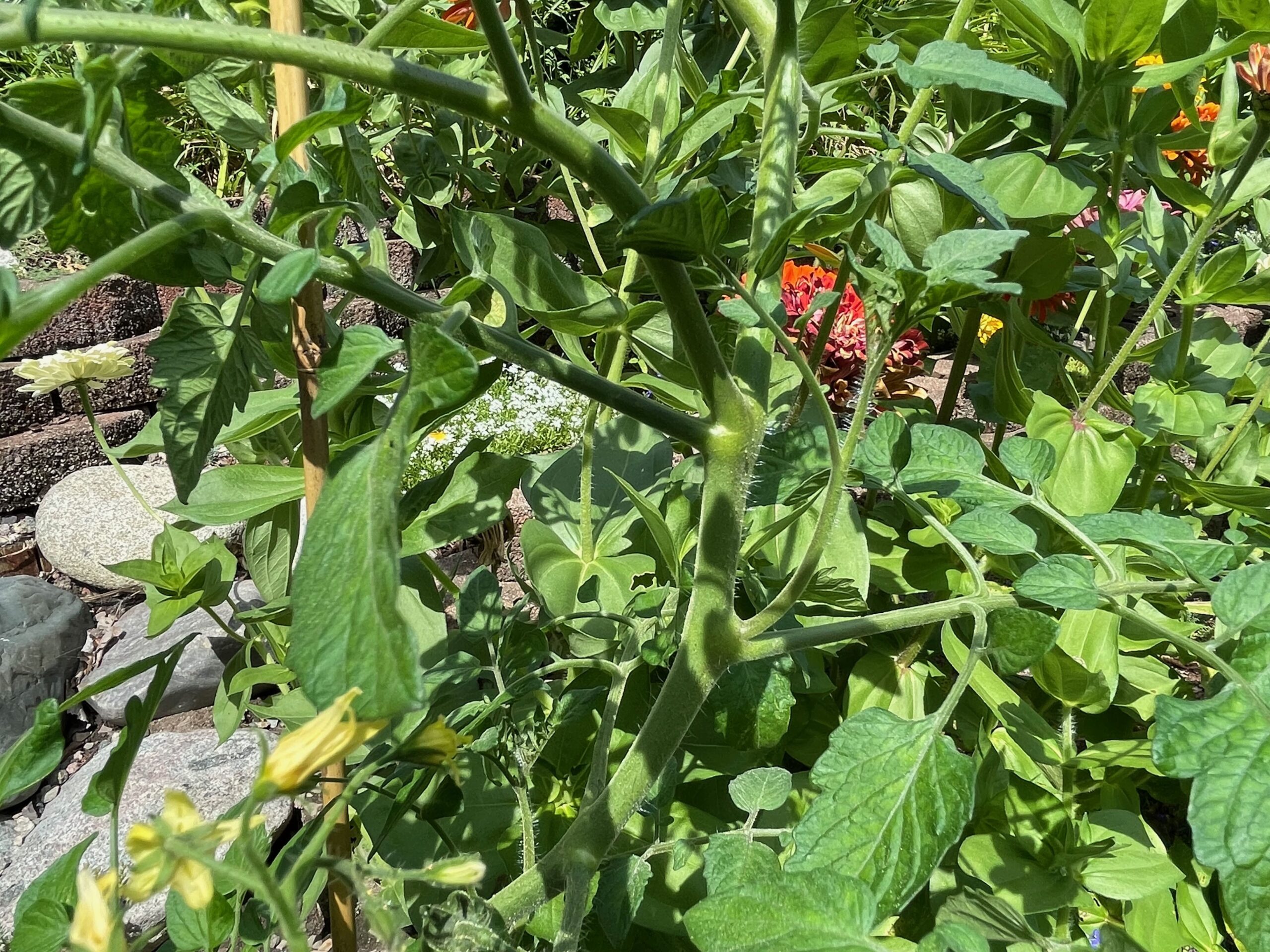 Oh, about that fifth tomato variety. Years ago, I planted a Sweet 100s cherry tomato that did very well. Despite my ignorance, it produced lots of delicious little beauties. At the end of the season, I tried to gather up all the unripe or fallen tomatoes, but of course that’s impossible. The stragglers left their seeds in the ground and some of the seeds wintered over and happily sprouted. Now, every year, I get volunteer Sweet 100s. All over. So this year I transplanted one volunteer plant to the official garden bed, and staked up another one that established residence in a flower bed. They’ll deliver ripe fruit in another week or so. More tomatoes to deal with.